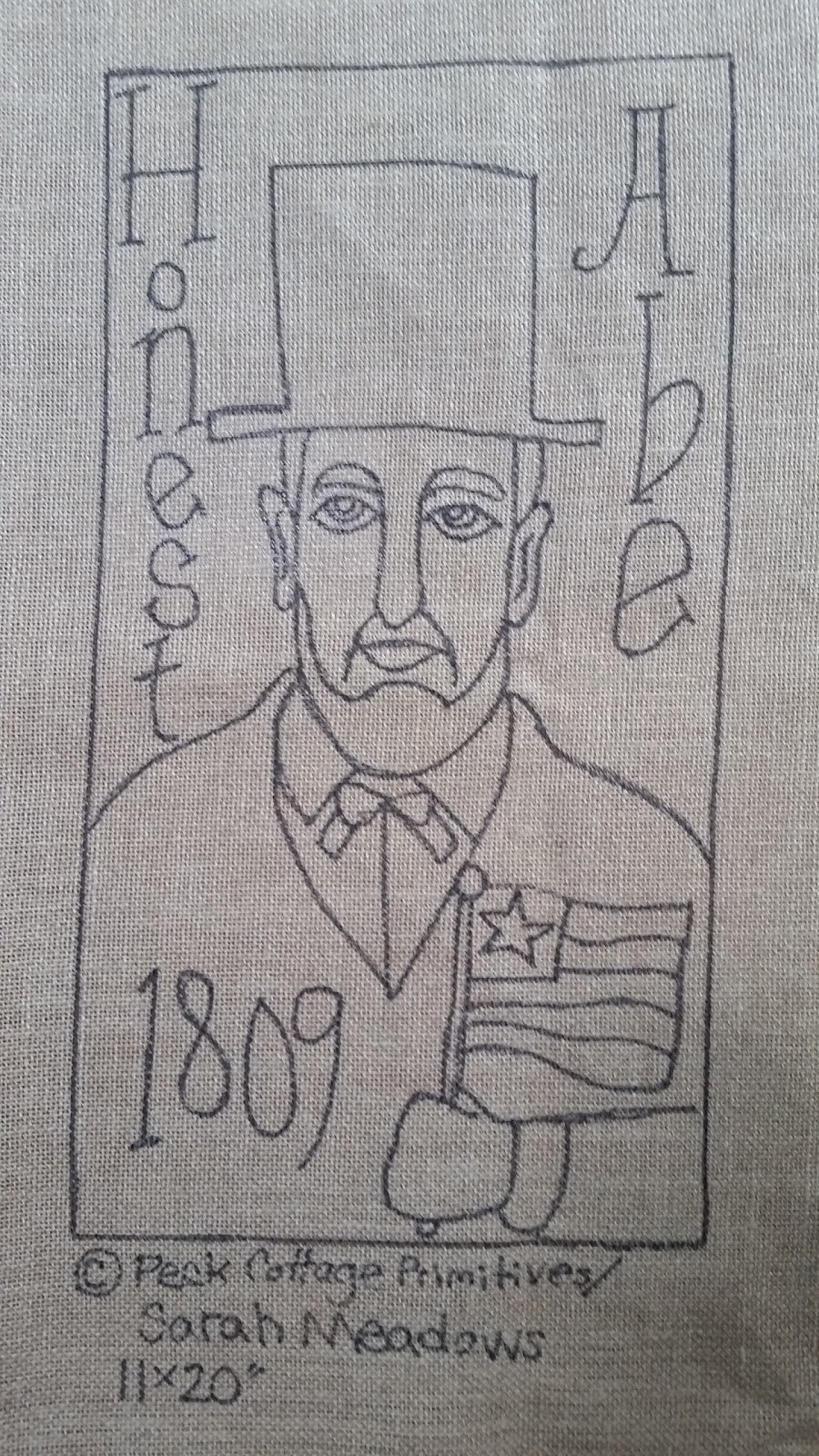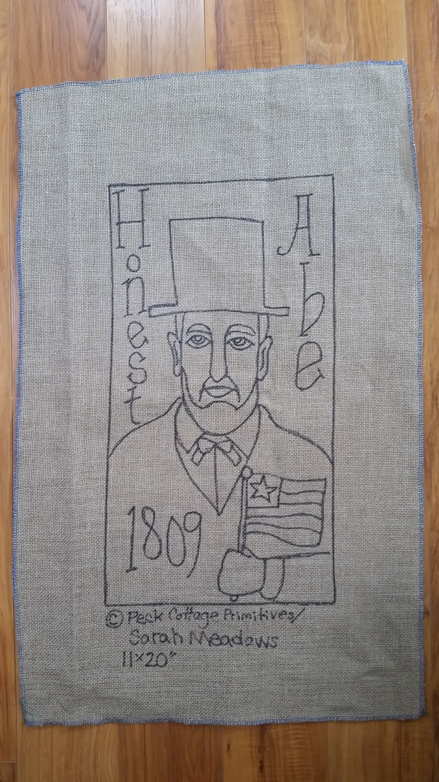 "Honest Abe"* measures 11x20" and is hand-drawn on primitive unbleached linen. There is ample space around him to ensure a snug fitting on your hooking frame. I have serged the edges to prevent fraying.